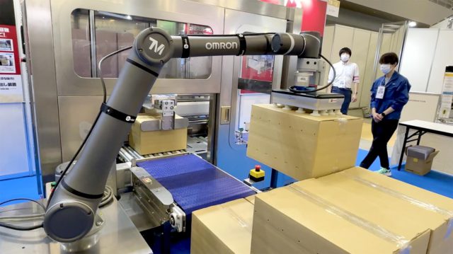 AMRで段ボールケースの搬送、協調ロボットでデパレタイジングとワークの投入を自動化〜「さらなる自動化」を実演展示し、重筋作業の改善をご提案させていただきました。